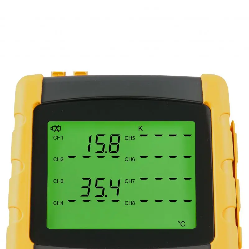 Das 4,5" Display mit grüner Hintergrundbeleuchtung erlaubt die Darstellung der aktuellen Messwerte von bis zu 8 Kanälen gleichzeitig (CH 1 ... CH 8). Um die Messwerte der Kanäle 9 ... 12 anzeigen zu lassen genügt nur ein Tastendruck. Das ermöglicht eine komfortable Auswertung, um den Überblick über Ihr komplettes System zu behalten (sofern alle zwölf Sensoren an das Messgerät angeschlossen sind). An den Temperaturdatenlogger können sechs verschiedene Sensortypen (K, J, T, E, R, S) angeschlossen werden.