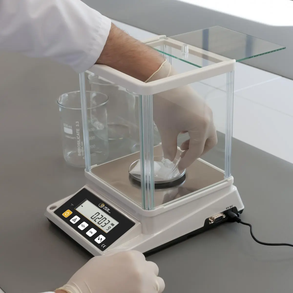 Neben den Messfunktionen verfügt die Analysenwaage auch über eine RS 232 Schnittstelle. Dank dieser Schnittstelle, lassen sich die Messwerte zum Beispiel auf einen PC übertragen. Diese Analysenwaage kann für den stationären als auch für den mobilen Einsatz verwendet werden. Für den mobilen Einsatz werden bei der Analysenwaage 3 x 1,5 V AA Batterien benötigt, die sich schnell und einfach einsetzen lassen.
