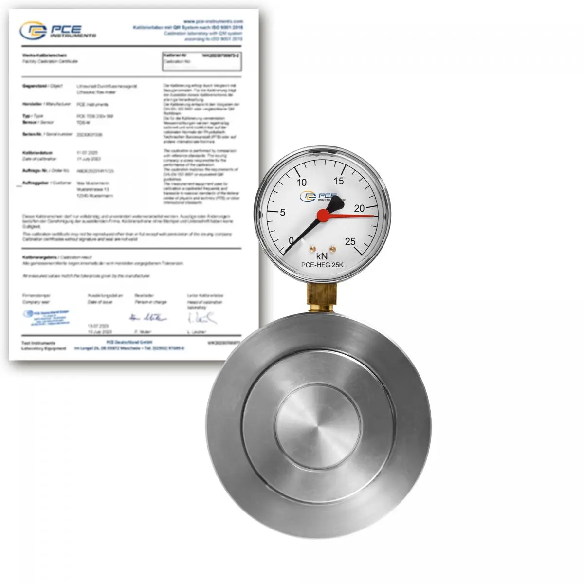 Eine Kraftmessdose basiert auf dem Prinzip, dass die Kraft die auf den Druckstempel wirkt, hydraulisch gemessen wird. Der erzeugte hydraulische Druck wird von der Kraftmessdose auf einer Skala in Newton angezeigt. Mit dem integrieren Schleppzeiger kann unsere Kraftmessdose den jeweiligen maximalen Messwert anzeigen.