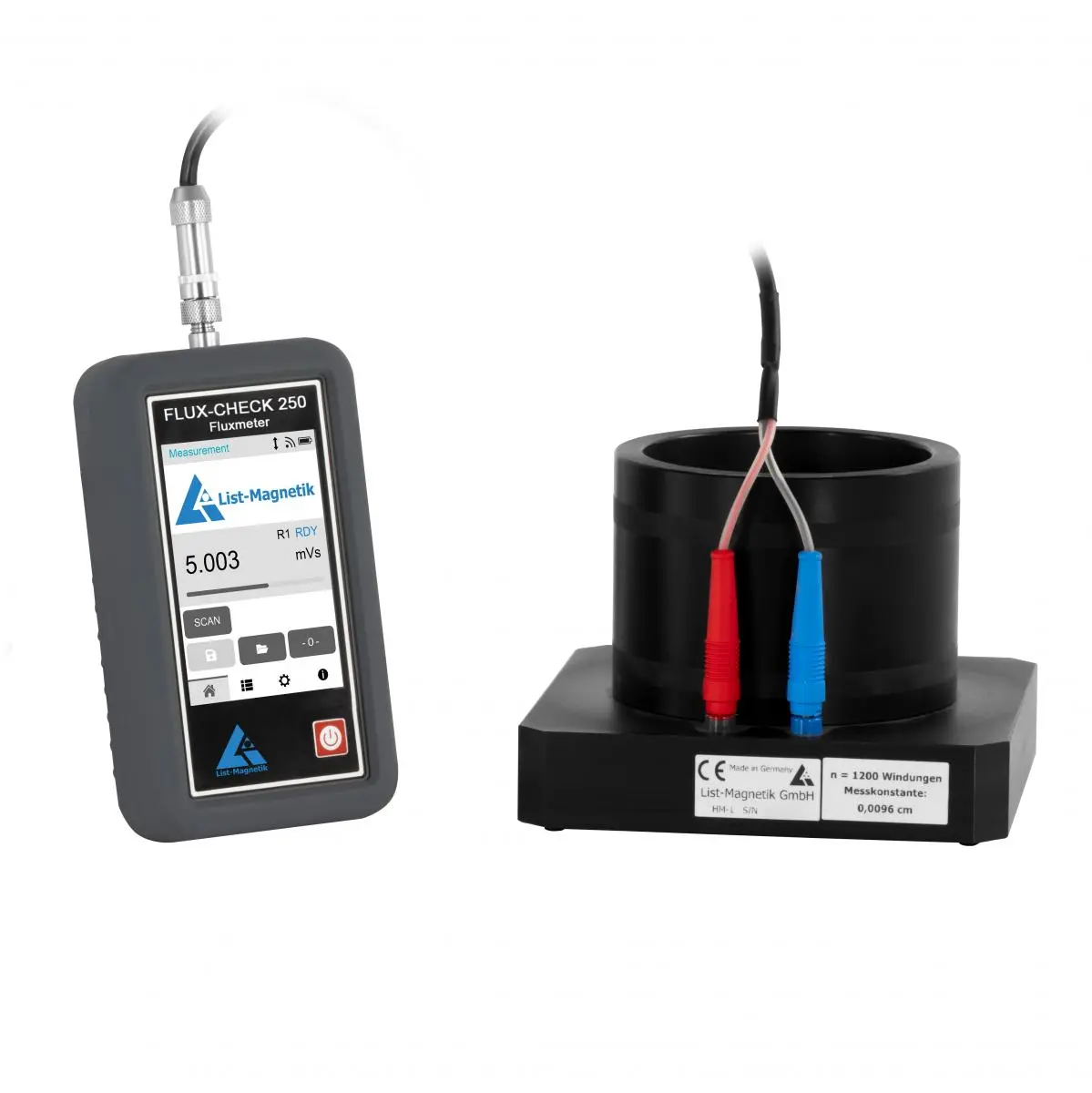 En combinación con la bobina de momento Helmholtz HM‑1 de List‑Magnetik, es posible determinar con gran precisión el flujo magnético de imanes permanentes, ya que se mide todo el volumen del imán sin depender de su posición. La influencia del imán sobre la bobina se registra en forma de una tensión eléctrica, que posteriormente se convierte en el valor de flujo. Además de la bobina HM‑1, el dispositivo permite conectar todo tipo de bobinas o sondas de bobina, lo que proporciona una gran flexibilidad en la inspección de materiales ferromagnéticos y en el análisis de materiales.