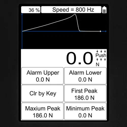 La carcasa robusta, y el menú intuitivo y sencillo convierten el medidor de fuerza digital en un equipo de fácil manejo. El medidor de fuerza digital se alimenta a través de un acumulador interno y se carga mediante una fuente de alimentación incluida en el envío. El tiempo operativo es de unas 10 horas. Todas estas propiedades permiten usar el medidor de fuerza digital en el control de calidad, en controles de entrada y salida de material así como en el desarrollo de nuevas piezas o para la comprobación de piezas de seguridad.