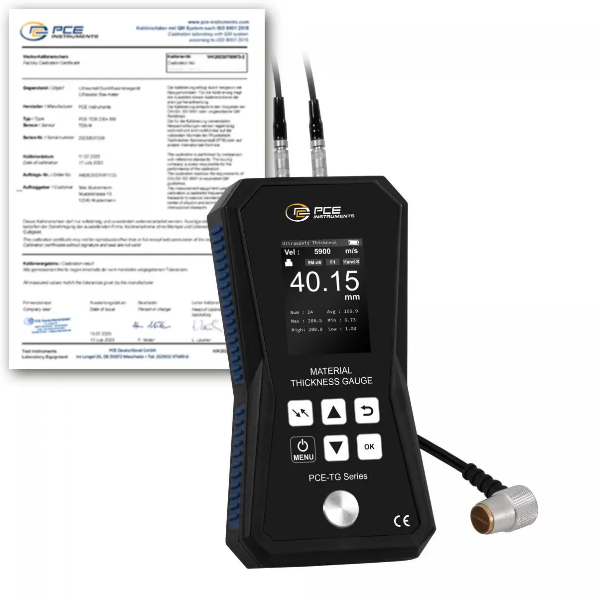 The Thickness Gauge has a data memory in which the measured values can be recorded. After a measuring procedure, the saved readings can be analysed directly in the Thickness Gauge. The saved data is displayed as a graph on the Thickness Gauge. In addition, each individual measuring point can be approached and read in the graph of the Thickness Gauge. To simplify the analysis of the measured values, the average, the highest and lowest measured values are displayed on the Thickness Gauge. The Thickness Gauge can optionally be supplied with an ISO calibration certificate.