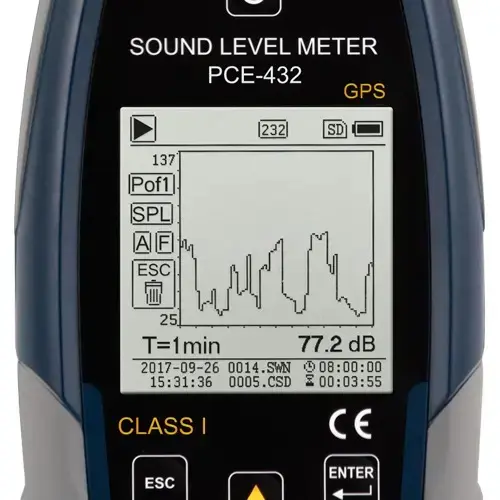 L'analyseur de bruit intégrateur de précision et d’impulsions est conforme avec toutes les normatives et les dispositions valides (classe 1,EN/IEC 61672, ANSI S1.4-1983, ANSI S1.43-1997 EN/IEC61260, etc.). L'analyseur de bruit intègre un grand écran avec rétroéclairage. L’écran affiche le niveau de pression acoustique de manière numérique et graphique en temps réel. L'analyseur de bruit dispose d’une mémoire pour enregistrer les données. Les valeurs sont stockées sur une carte micro SD. Vous pourrez lire les valeurs directement sur votre PC. Vous pouvez aussi connecter l'analyseur de bruit par USB à votre PC et lire les valeurs de la mémoire. Le logiciel de l'analyseur de bruit permet de réaliser une analyse des valeurs.