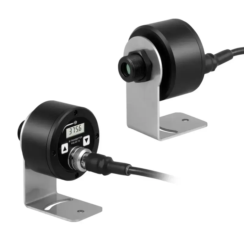 L'appareil de mesure de température est fabriqué en acier inoxydable et avec une classe de protection IP65. Le capteur infrarouge compact est monté à l’aide d’une équerre de montage d’un angle de 90°. Cela permet un montage fixe permettant une surveillance permanente des points à mesurer.