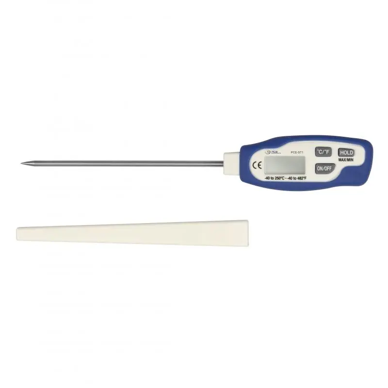 Le contrôleur de température PCE-ST 1 est un thermometre digital portable pour mesurer dans le secteur alimentaire par exemple, la viande, la charcuterie, le fromage, la tomate, etc… puisqu’il est équipé d’une sonde en acier inoxydable de 120 mm. Ce thermomètre de contact se distingue par son usage facile, ses dimensions réduites et son bref temps de réponse.Il s’utilise donc le plus souvent dans l’industrie alimentaire, les usines de bière, différents laboratoires dans l’industrie, les pharmacies ou pour un simple contrôle rapide de la température. Le thermomètre est livré avec un étui de protection pour le capteur et une batterie.