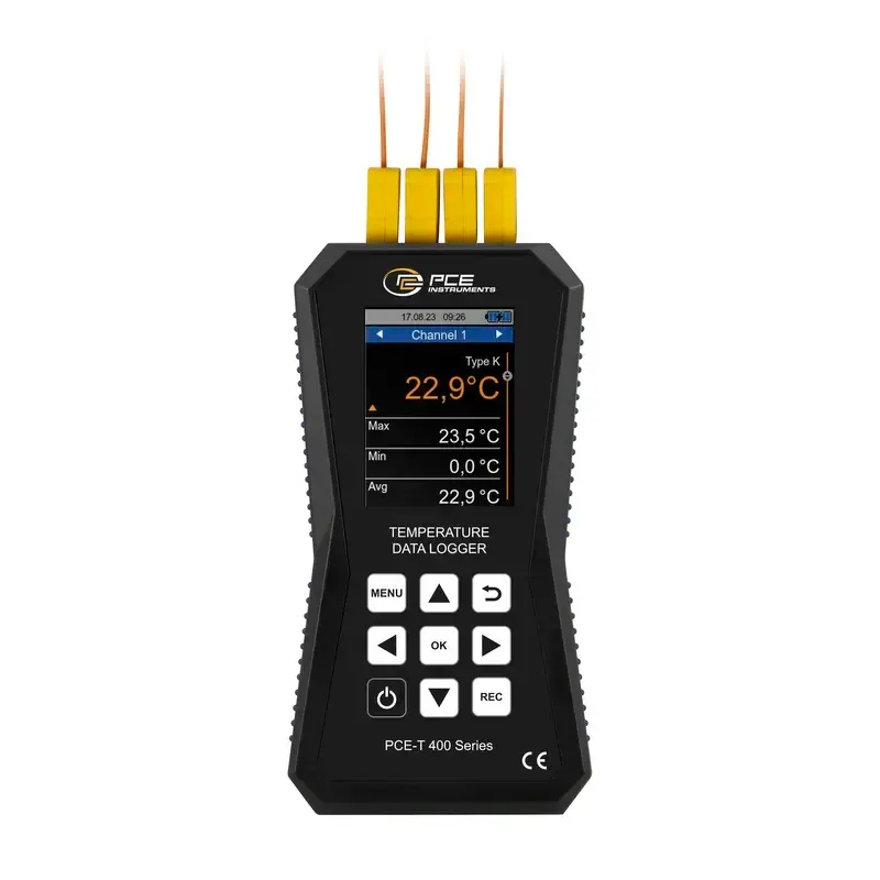 Le contrôleur de température à 4 canaux pour thermocouples permet l’affichage et l’enregistrement simultané de plusieurs capteurs de température. Ce controleur de temperature possède 4 canaux auxquels on peut connecter 8 types de thermocouple différents. Une caractéristique notable du contrôleur de température est la précision de l’appareil pour les thermocouples de type K : ± (0,04 % + 0,3 °C). À cela doit s’ajouter la précision particulière des thermocouples utilisés afin de pouvoir déterminer la précision globale.