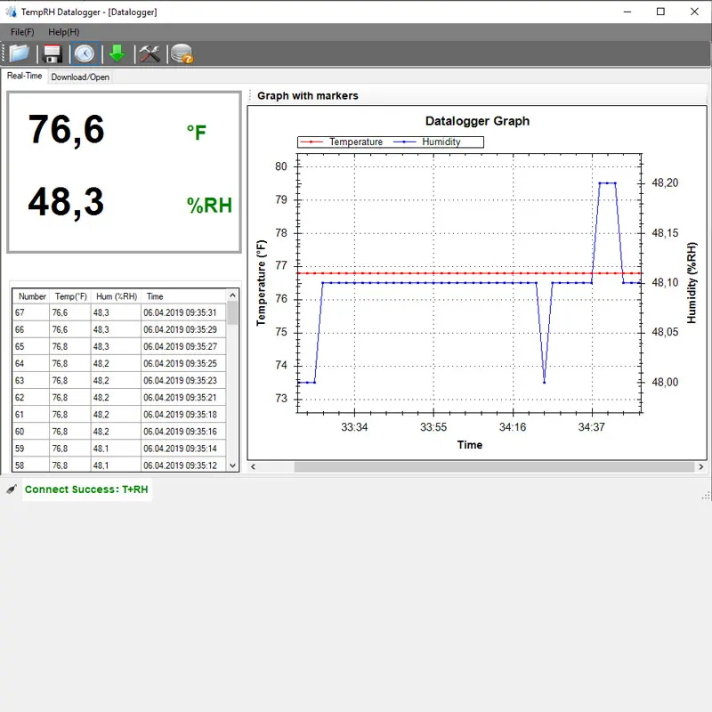 La fréquence d’enregistrement est réglable entre 2 secondes et 24 heures, ce qui rend possible un enregistrement de longue durée. Une particularité de cet humidimètre est qu’il ne nécessite pas de logiciel pour extraire les données. Il génère automatiquement un rapport en PDF qu’il est possible d’extraire sur un PC. Ce rapport