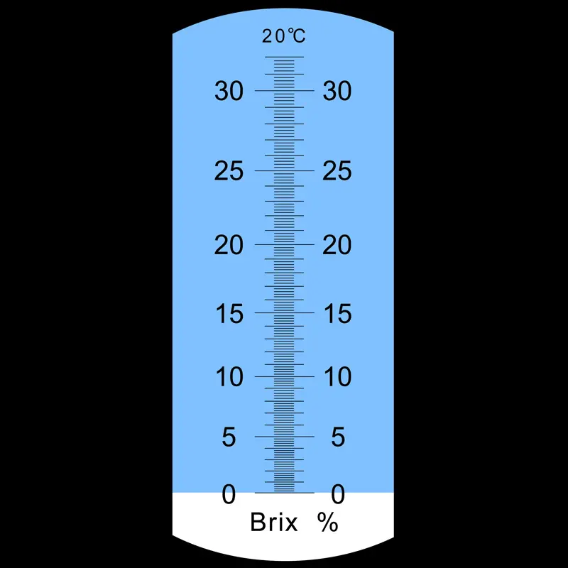 L'échelle de l'instruments de mesure pour l'agriculture à éclairage a été conçue pour travailler à une température de 20 ºC. Il faut tenir compte du fait que l'indice de réfraction d'un matériau dépend de la température. Pour cette raison, il est important de prendre en compte que, aussi bien le dispositif que l'échantillon doivent avoir la même température. Comme la température ambiante à laquelle le dispositif doit s'adapter n'est généralement pas de 20 ºC, la compensation de température intégrée facilite la tâche de mesure. De même que dans les thermomètres, l'instruments de mesure pour l'agriculture analogique utilise une bande bimétallique. En fonction de la déformation de la bande comme conséquence de la température, il y a déplacement sur l'échelle Brix. Grâce à cela, on parvient à obtenir la valeur Brix correcte. Sans cette compensation de température automatique -dont la spécification peut être abrégée avec les sigles ATC- il faudrait constamment étalonner la valeur à la température correspondante, ou mesurer en plus la température, et corriger la valeur Brix mesurée à la température de 20 ºC.
