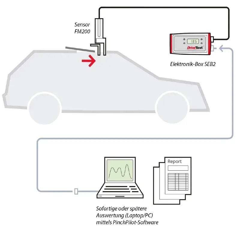 Le mesureur de force de fermeture est un appareil qui détermine, dans le secteur automobile, la force de pincement des lève-vitres électriques, des toits-ouvrants et des coffres. Les centres de contrôle technique s’en servent aussi de plus en plus. Il est utilisé pour l’inspection finale des nouvelles installations, ainsi que pour les inspections périodiques. Son design associe la précision à la résistance, et garantit l’exactitude des valeurs de mesure même après des années d’utilisation dans des milieux difficiles.