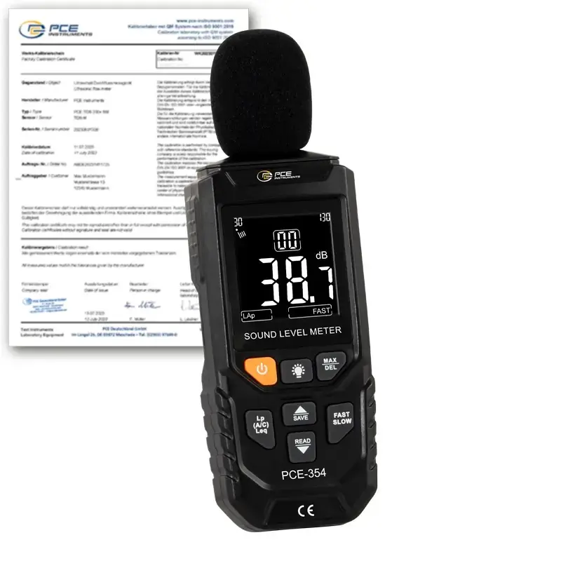 Mesureur d'environnement intégrateur / Mesure Peak / Pondération de fréquence A et C / Plage : 30 ... 130 dB / Fonction MAX-Hold / Mémoire pour 99 valeurs / Écran avec rétroéclairage / Certificat d'étalonnage ISO