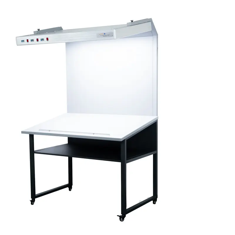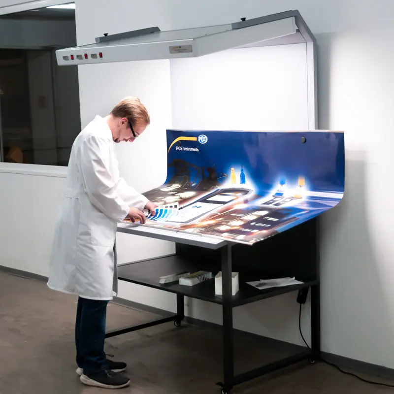 La cabine d'éclairage colorimétrique est un appareil très important dans l’industrie graphique. Grâce à la cabine d'éclairage colorimétrique, vous pouvez vérifier la coïncidence des couleurs et le métamérisme des imprimés, juste avant leur fabrication. La cabine d'éclairage colorimétrique est idéale, non seulement dans l’industrie graphique, mais aussi pour les agences de publicité, la presse et les maisons d’édition, ainsi que partout où il est nécessaire de vérifier la couleur de grands objets. Le positionnement des sources de lumière garantit un éclairage optimum de la table et du panneau arrière. Cela vous permet d’avoir une surface horizontale et verticale comme niveau d’observation.