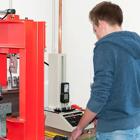 Use of the motorized material test stand requires an AC power connection. The feed rate is adjustable between 50 ... 500 mm / min using the controls on the front panel. The traverse / distance also can be adjusted.