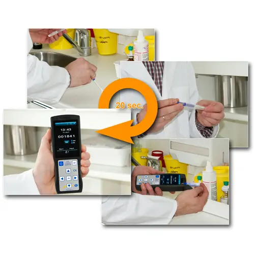 L'analizzatore di ATP PCE-ATP 1 viene utilizzato per rilevare rapidamente e semplicemente la pulizia delle superfici. L'analizzatore di ATP dopo 10 secondi indica il valore di misura nell'ampio display LCD. La memoria interna dell'analizzatore di ATP permette di registrare fino a 10.000 valori con data e ora. L'analizzatore di ATP PCE-ATP 1, che viene utilizzato con le provette di superficie (PCE-ATP Swab), permette di rilevare rapidamente i microorganismi o i residui degli alimenti sopra qualsiasi superficie come controllo effettivo della pulizia e della disinfezione. La determinazione quantitativa di ATP (adenosina tri-fosfato) cosi come di AMP (adenosina mono-fosfato) viene effettuata nell'analizzatore di ATP portatile PCE-ATP 1. Può registrare i valori di misura e processarli successivamente. L'analizzatore di ATP viene utilizzato nelle farmacie, nella medicina, nella gastronomia, nel commercio, etc. Le misure con l'analizzatore di ATP sono effettuate mediante le provette di superficie ATP. Con il tampone incluso nella provetta controlla la superficie. Il tampone viene spinto fino al fondo della provetta perchè entri in contatto con il liquido reattivo. Agitando lievemente si raccoglie il liquido reattivo nella camera di reazione della provetta. La provetta di superficie viene introdotta al completo nella camera di misura dell'analizzatore di ATP PCE-ATP 1. Successivamente inizia la misura. Dopo 10 secondi viene visualizzato il risultato in RLU (Relativ Light Units) nel display dell'analizzatore di ATP . Può utilizzare l'analizzatore di ATP PCE-ATP 1 per differenti settori commerciali. L'analizzatore di ATP permette un controllo ed una documentazione esaustiva nell'industria alimentare, per esempio nel controllo delle cucine industriali o durante la lavorazione degli alimenti a livello industriale. L'analizzatore di ATP PCE-ATP 1 aiuta ad implementare il concetto HACCP. Oltre all'uso nell'industria alimentare, anche le imprese di pulizia possono utilizzare l'analizzatore di ATP per controllare i loro servizi di pulizia. La memoria dell'analizzatore di ATP PCE-ATP 1 archivia la data e l'ora delle varie misure, ed è inoltre possibile aggiungere differenti utenti per differenziare i vari valori registrati. Un altro ambito di applicazione dell'analizzatore di ATP è il settore della sanità. Può utilizzare l'analizzatore di ATP in tutti i luoghi dove è imprescindibile tenere le superfici pulite e sterili.