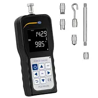 Il dinamometro PCE-FM 200 è un dispositivo portatile che misura la forza fino a 200 N. Il dinamometro misura nelle unità di misura N, kg e lb. La fornitura include vari adattatori di vario formato da avvitare al dispositivo, in modo da poter trovare la soluzione più adeguata in base alla prova di trazione o compressione che deve essere eseguita e anche in base alle proprietà della superficie. La fornitura include inoltre un'asta telescopica che consente di penetrare nelle zone di più difficile accesso. La lunghezza dell'asta è di 65 mm. Gli adattatori inclusi sono: adattatore a testa piatta, a gancio, a punta, a lama e a V. L'adattatore a gancio viene utilizzato per le prove di trazione.