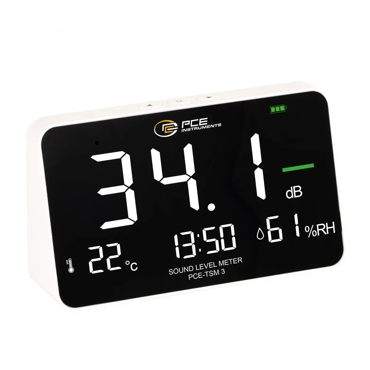 Lo strumento ambientale registra i livelli sonori nell'intervallo da 30 ... 130 dB con una risoluzione fine di 0,1 dB e una precisione di ±1,5 dB. Copre inoltre una gamma di frequenze di 50 ... 8500 Hz e offre quindi un'ampia base di rilevamento per diverse fonti di rumore. Oltre alla pressione sonora, il dispositivo misura anche l'umidità nell'intervallo tra il 20 ... 85 % e la temperatura tra -10 ... +60 °C, con la possibilità di commutare la visualizzazione della temperatura in Fahrenheit.
