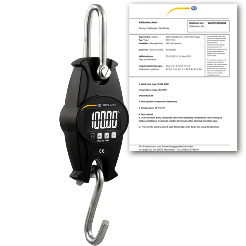 Bilancia per carroponte/gru con struttura in metallo / Range di misura: 0 ... 100 kg / Spegnimento automatico dopo 15 minuti di inattività / Alimentazione a batterie / Funzione "HOLD" / Altezza cifre: 22 mm / Unità di misura: kg, lb, N / Rapporto di taratura ISO incluso