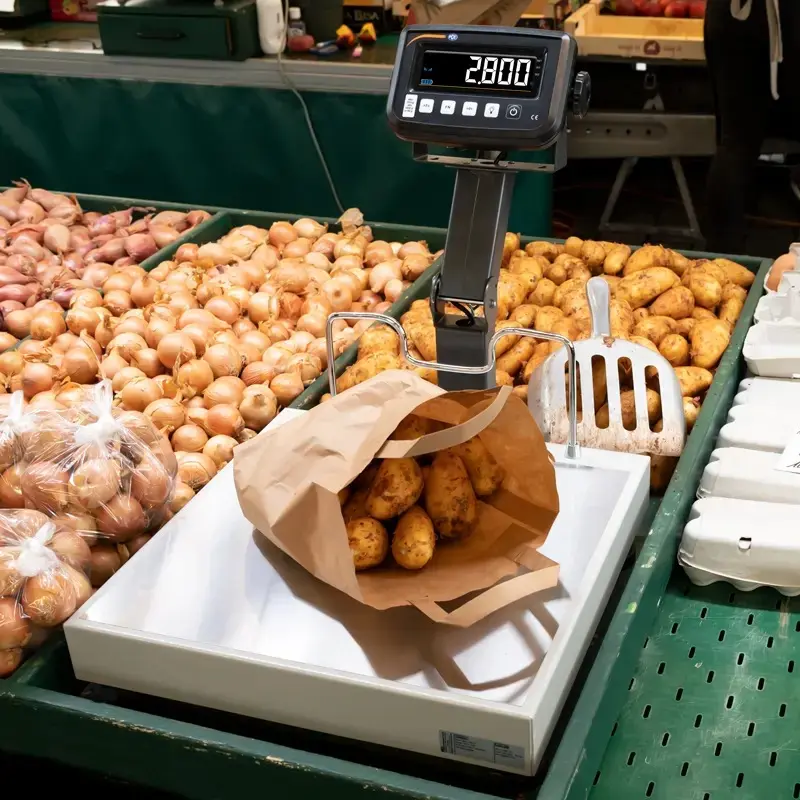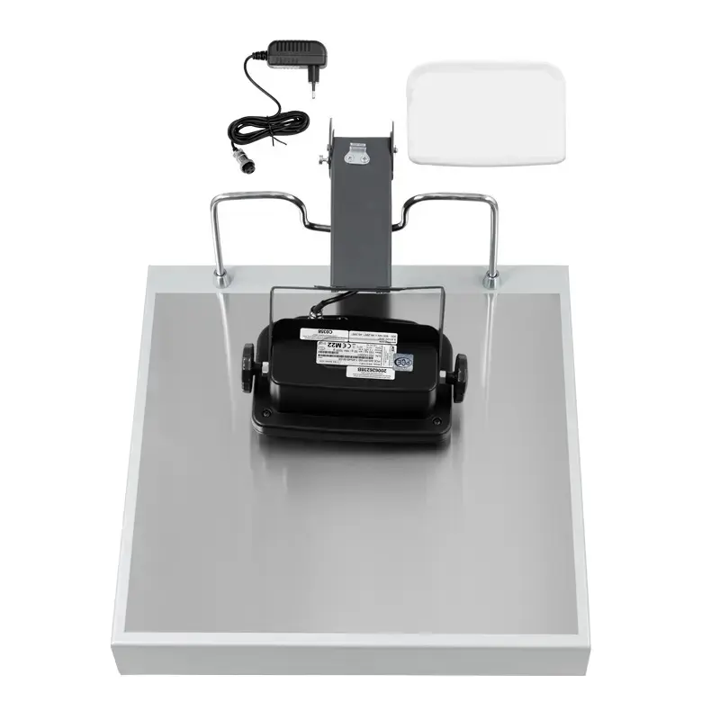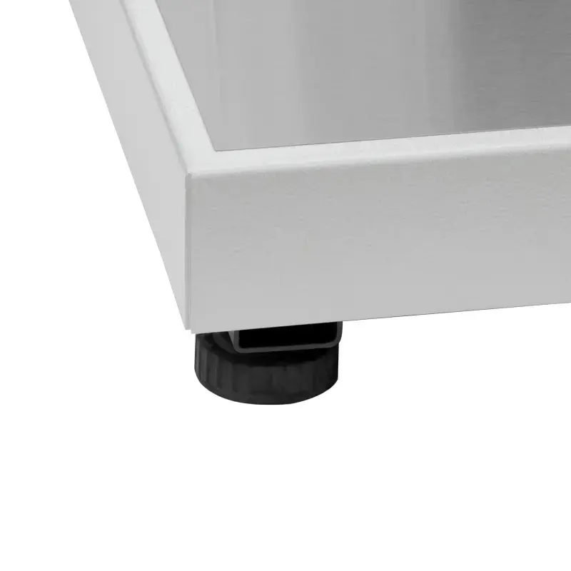 La surface utile de la plateforme de la balance industrielle est de 45 x 42 cm. Sur le côté où se trouve le support avec l’écran, il y a un support qui aide à placer correctement la charge à peser. La balance industrielle présente un revêtement de peinture en poudre. D’autre part, la surface de la plateforme possède une fine couche en acier inoxydable.
