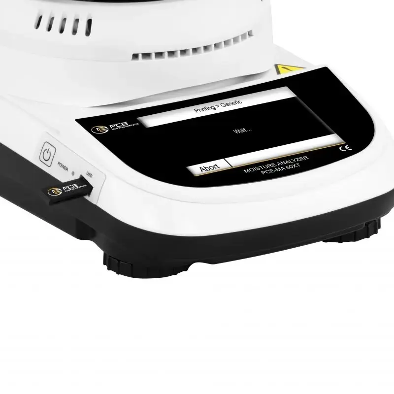 Analyseur d'humidité de précision / Plage maximale : 60 g / Résolution : 0,1 mg = 0,0001 g = 0,001 % Humidité / Température de séchage maximale : 160°C / Écran tactile couleur de 5" / Base de données pour 300 mesures, 30 paramètres de séchage et 10 utilisateurs