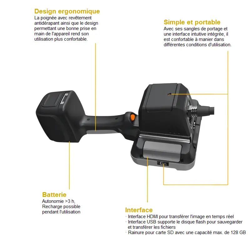 L’écran tactile de l’endoscope est de 7". La résolution de l’écran de l’endoscope est de 1920 x 1200 pixels. L’écran tactile garantit une facile utilisation de l’endoscope. Il est possible de transférer l’image de l’endoscope, via l’interface HDMI, sur un écran externe ou un projecteur. Vous pouvez sauvegarder 285 000 images ou 1500 minutes d’enregistrement vidéo dans la carte SD. Cela permet d’examiner ultérieurement les images et les vidéos via l’écran de l’endoscope. Il est aussi possible d’extraire les fichiers via un ordinateur.