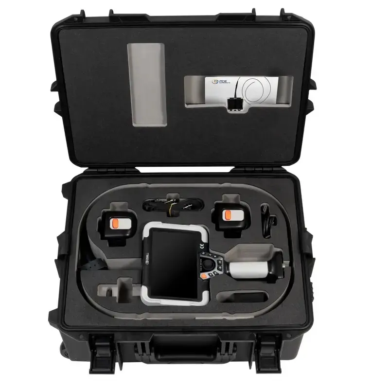 Grâce à l’articulation dans 4 directions, il est possible de faire tourner la tête de l’endoscope digitale dans un rayon de courbure de 190º. L’angle de vision de l’endoscope est de 120º. La tête articulée est contrôlée au moyen d’un joystick qui actionne le moteur électrique de l’endoscope. Selon le type de sonde endoscopique, la tête aura un diamètre compris entre 2,2 et 6 mm, ce qui permet d’utiliser cet endoscope pour inspecter des moteurs, des armes à feu, des perforations et d’autres petites ouvertures. Cela signifie que l’endoscope peut examiner rapidement et facilement des soudures, des usures et des imperfections afin de réaliser des diagnostics rapides. Le revêtement de la sonde endoscopique est en tungstène torsadé. La tête de la caméra de l’endoscope est en alliage de titane. Cela rend la sonde endoscopique particulièrement résistante. L’endoscope est utilisé par exemple dans les industries, les bureaux d’études, le contrôle de qualité et dans les expertises.