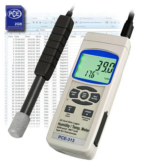 Ce mesureur climatologique a été conçu pour un usage professionnel dans le secteur de la climatisation. Le mesureur climatologique détermine l'humidité relative et la température ambiante. A travers la connexion pour les thermo-éléments type K vous pourrez détecter par exemple la température d'un mur avec une sonde superficielle. La mémoire interne du mesureur climatologique à travers de la carte SD (1 à 16 GB) vous permet d'enregistrer les valeurs de l'humidité et de la température avec un réglage libre de la part de mesure, soit pour des mesures en temps réel ou pour un stockage de données. Pour cela il vous faudra programmer préalablement le mesureur climatologique avec le clavier, et ensuite laisser l'appareil enregistrer les valeurs (sans avoir besoin d'être présent durant ce temps là). Pour des registres prolongés nous conseillons d'alimenter le mesureur climatologique avec un composant de réseau (optionnel). Les valeurs enregistrées peuvent se transférer au PC pour son analyse postérieure (fichier xls sur la carte SD).