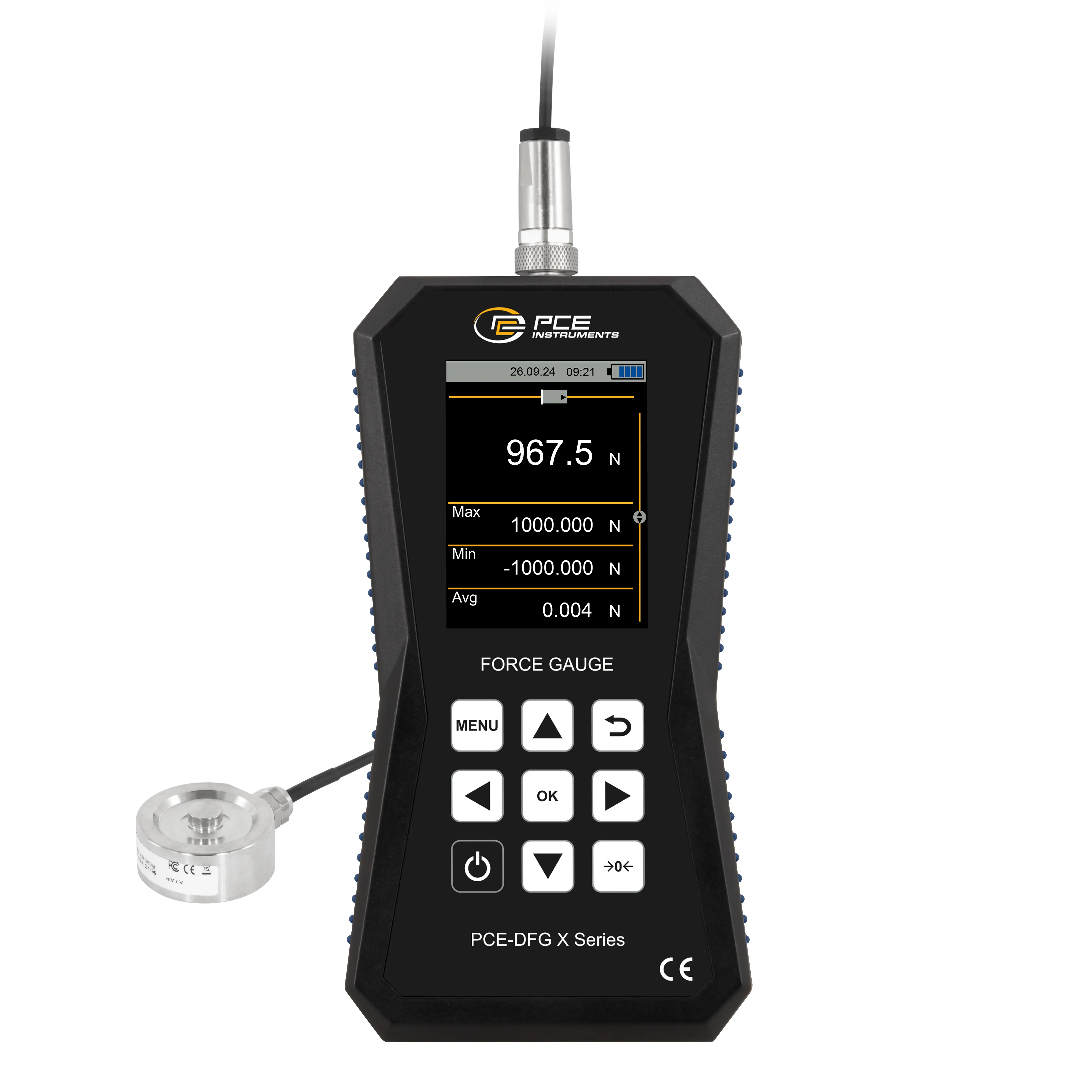 Mesureur de force avec cellule de charge externe pour compression jusqu'à 1000 N / Différents modes d'alarme / Affichage graphique / Enregistrement des données / Logiciel inclus