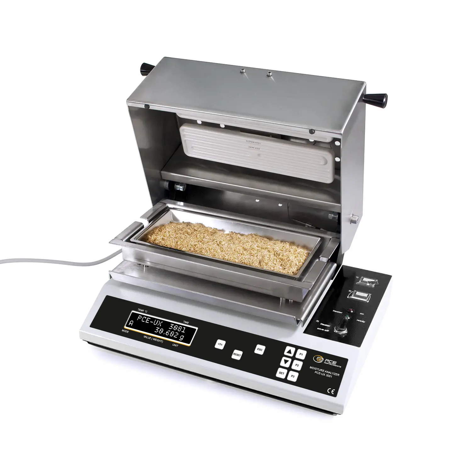 Con un rango de pesaje máximo de muestra de 400 g, un volumen de muestra de 360 cm³ y una alta resolución de medición de 0,001 g, garantiza mediciones de humedad precisas y fiables. La balanza funciona según el principio de secado con medición del peso simultánea. La pérdida de peso se registra continuamente y se muestra como porcentaje de la masa total. Equipada con una potencia de calentamiento de 2 x 250 W y una temperatura de calentamiento ajustable de 40 a 220 °C, la balanza de precision ofrece un secado rápido y flexible de las muestras. Para la evaluación de las mediciones el dispositivo dispone de diferentes parámetros como % de humedad, % de masa seca, % de humedad ATRO, g de peso residual/kg y peso residual.