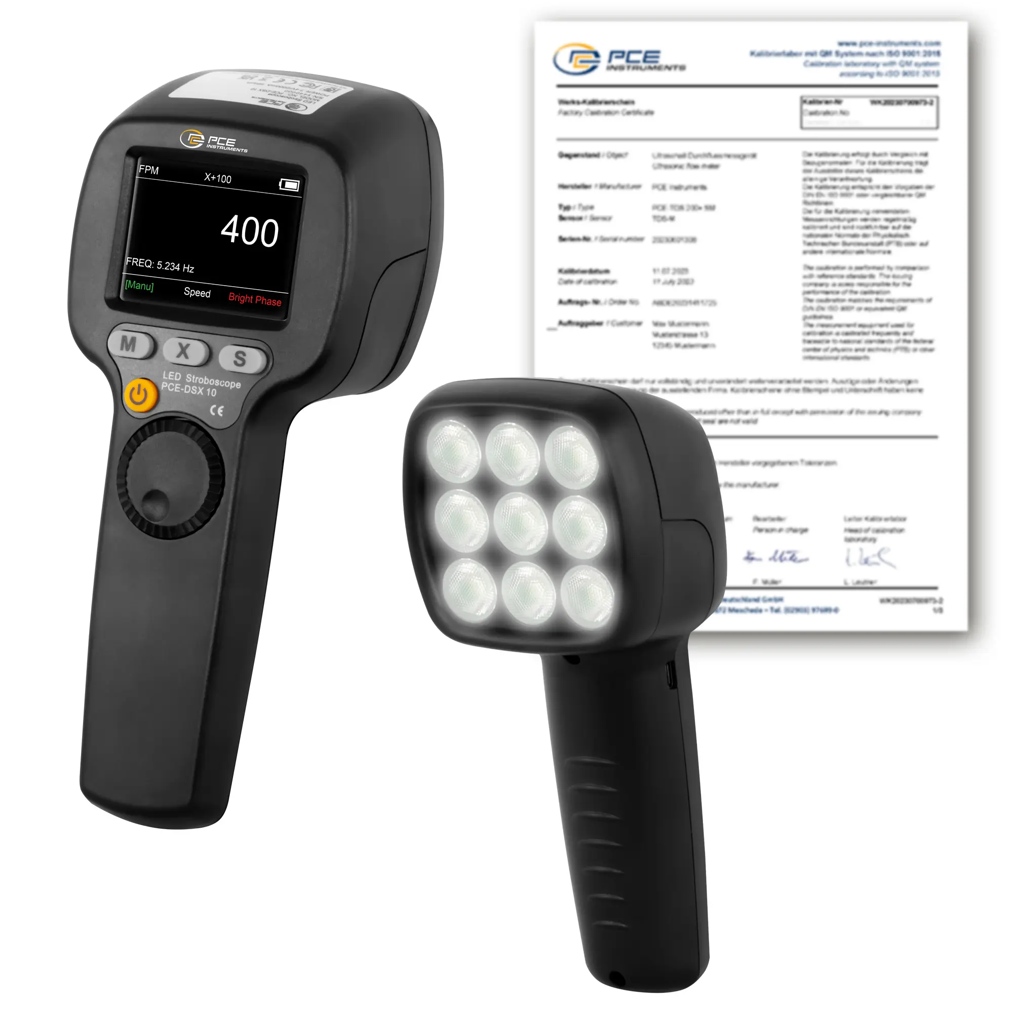Aparato de automoción con 9 LED potentes / Intensidad luminosa de 1500 lux / Frecuencia de destello en FPM y Hz / Desfase / Duplicación y división de FPM / Manejr rápido y sencillo con botón giratorio / Incluye certificado de calibración ISO
