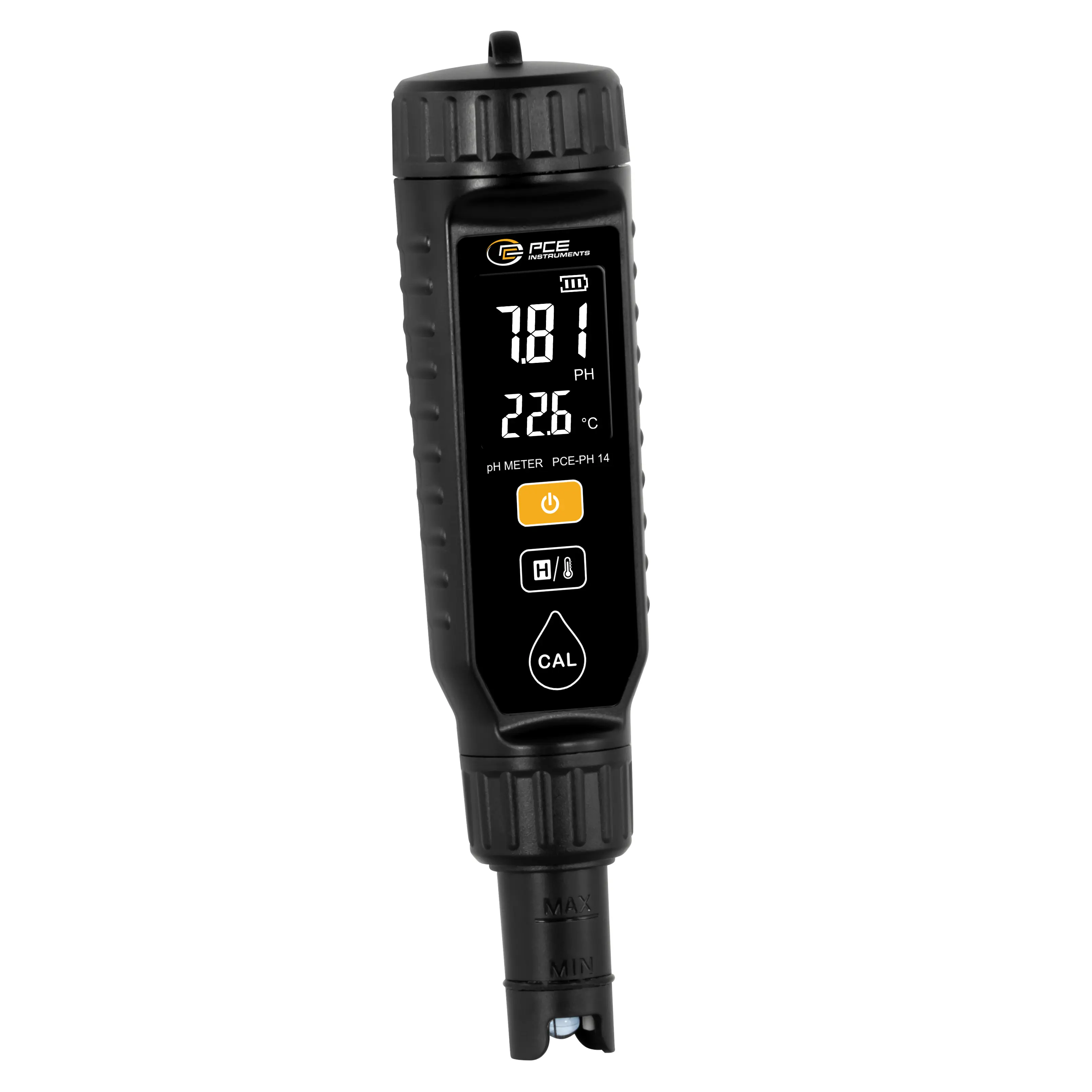 Los rangos de medición de pH son de 0 ... 14 pH con una resolución de 0,01 pH y para la temperatura de 0 ... 60 °C o 32 ... 140 °F con una resolución de 0,1 °C/°F. La calibración automática garantiza una precisión de medición fiable, mientras que la desconexión automática tras 10 minutos de inactividad prolonga la autonomía de la batería. El controlador ambiental es compacto, fácil de usar y muestra los valores de pH y temperatura simultáneamente en la pantalla LCD a color. También indica el estado de carga de la batería de litio integrada.