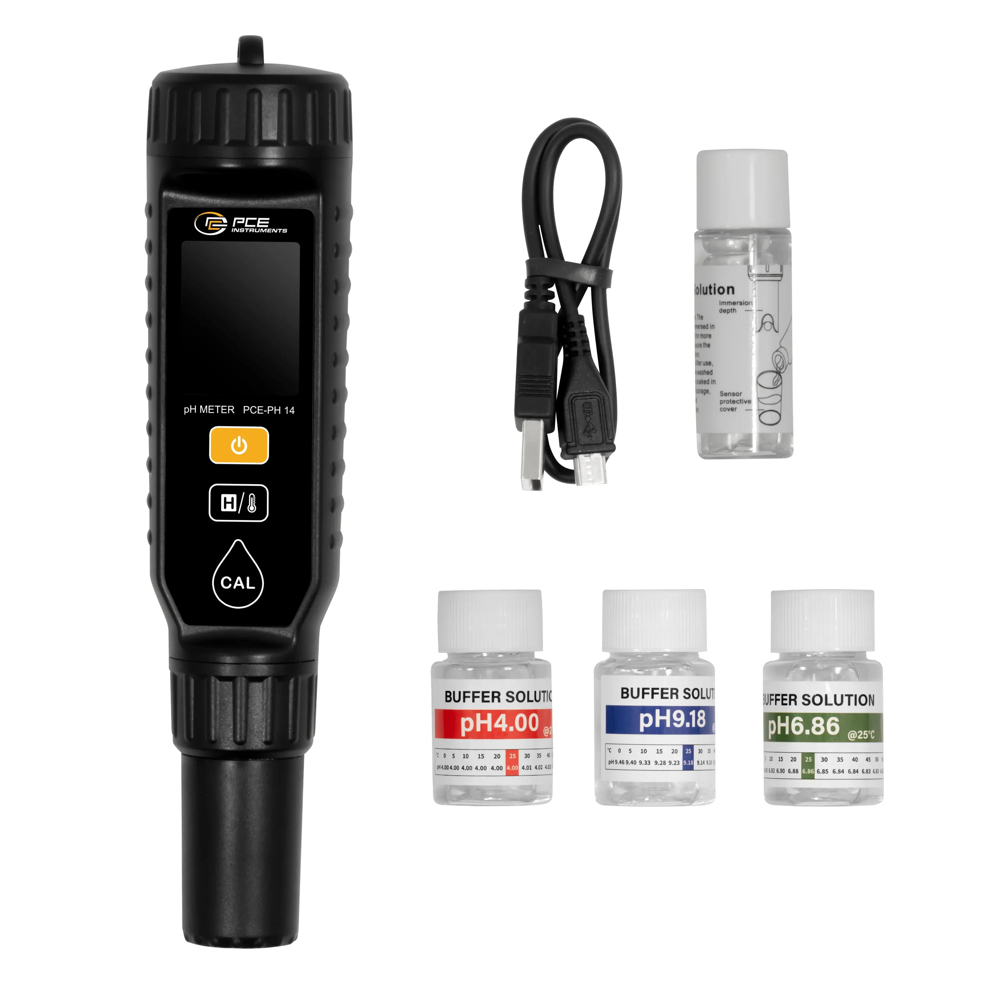Estas características hacen que el controlador ambiental sea ideal para aplicaciones en la industria, la agricultura, la investigación, la medicina y la protección del medio ambiente. En el contenido de envío se incluyen 3 soluciones de calibración, una solución de conservación y un cable micro USB para cargar la batería.