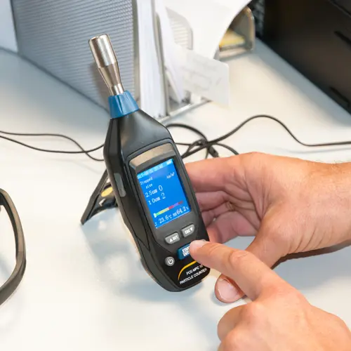 El medidor de calidad del aire permite medir la concentración de partículas de forma rápida. El medidor de calidad del aire es un equipo que se usa para medir en ambientes donde la concentración de polvo influye en las condiciones ambientales y en el cuerpo humano. Se usa sobre todo en ambientes donde las partículas se concentran en el aire. Esto es sobre todo el caso en la industria, donde se realizan trabajos de lijado que generan polvo industrial. El medidor de calidad del aire realiza mediciones orientativas que le darán una idea sobre la tendencia de concentración e información sobre las fuentes de contaminación.