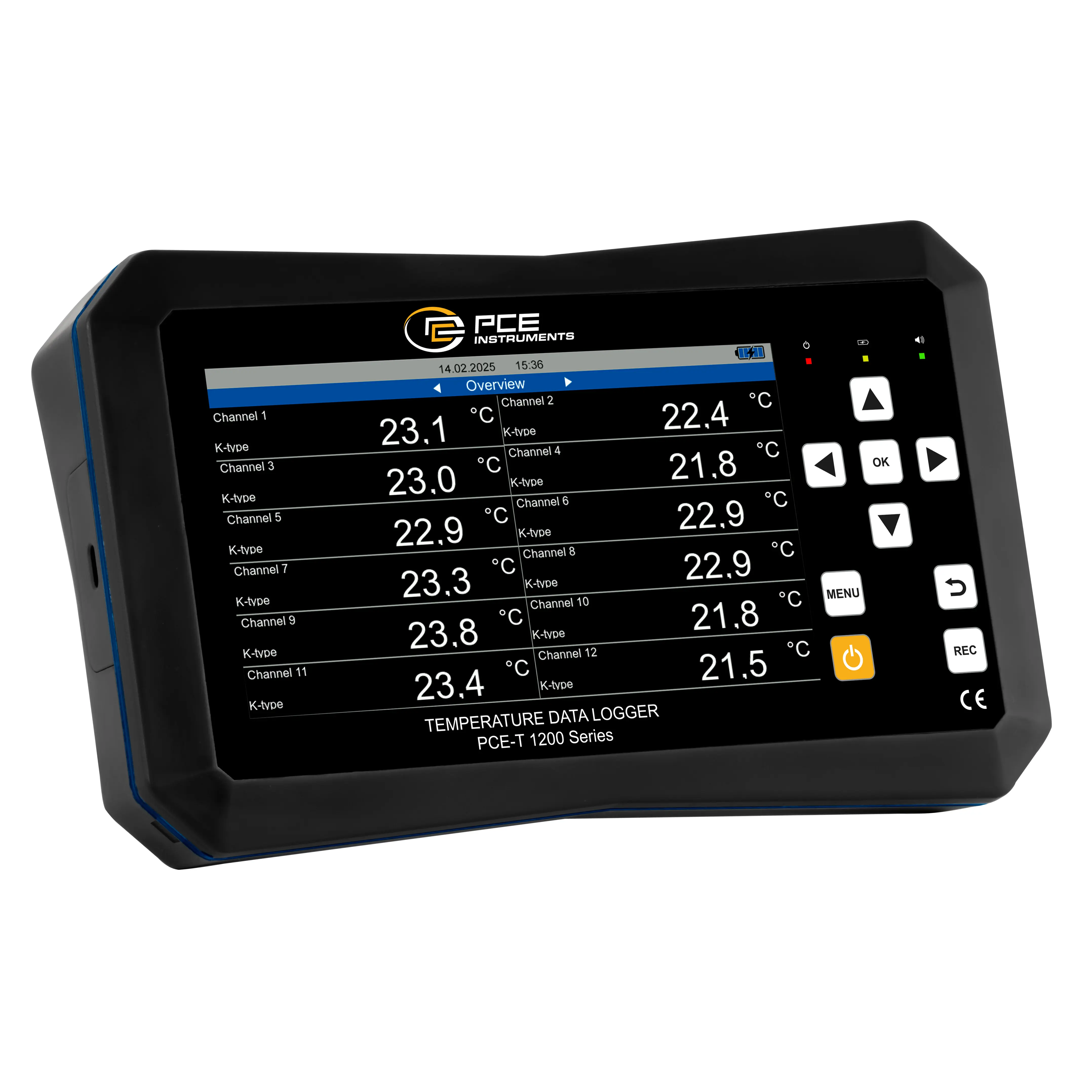 Nuestro registrador de datos de 12 canales permite el uso de diferentes tipos de termopares. Puede conectar hasta 8 tipos de termopares diferentes al registrador de datos: K J, E T, N, S, R, B. Puede visualizar y almacenar simultáneamente los valores de varios sensores de temperatura. El amplio rango de medición de -200 ... +1800 °C hace que el registrador de datos sea ideal para una amplia gama de aplicaciones, desde temperaturas criogénicas hasta procesos de alta temperatura. Destaca en especial su elevada precisión, sobre todo para termopares de tipo K con una precisión de ±(0,04 % del valor + 0,3 K).