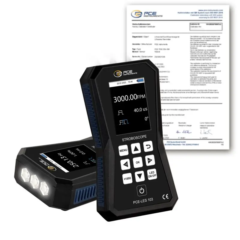 Con nuestro tacómetro LED puede analizar el movimiento de máquinas giratorias de forma rápida y sencilla. El tacometro LED está equipado con 3 LED de alta potencia, que juntos generan una intensidad luminosa de 11730 lux a 20 cm y 1000 Hz. El tacómetro LED permite ajustar con precisión la frecuencia de destello tanto en FPM como en Hz. Además, es pequeño, manejable y portátil gracias a su batería recargable.