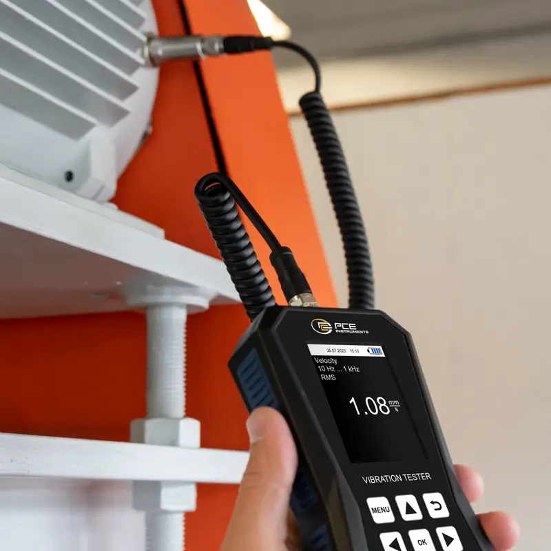 El vibrómetro es una herramienta ideal para el personal de mantenimiento pues le permite comprobar de forma rápida las vibraciones en piezas, máquinas o instalaciones. Este vibrometro indica en pantalla los valores de aceleración, velocidad y desplazamiento. Esto le permite detectar y hacer un seguimiento del desequilibrio y los daños en cojinetes. El vibrómetro integra un modo para realizar una medición según la normativa ISO 10816-3. El vibrometro analiza los valores e muestra en pantalla una valoración del estado.