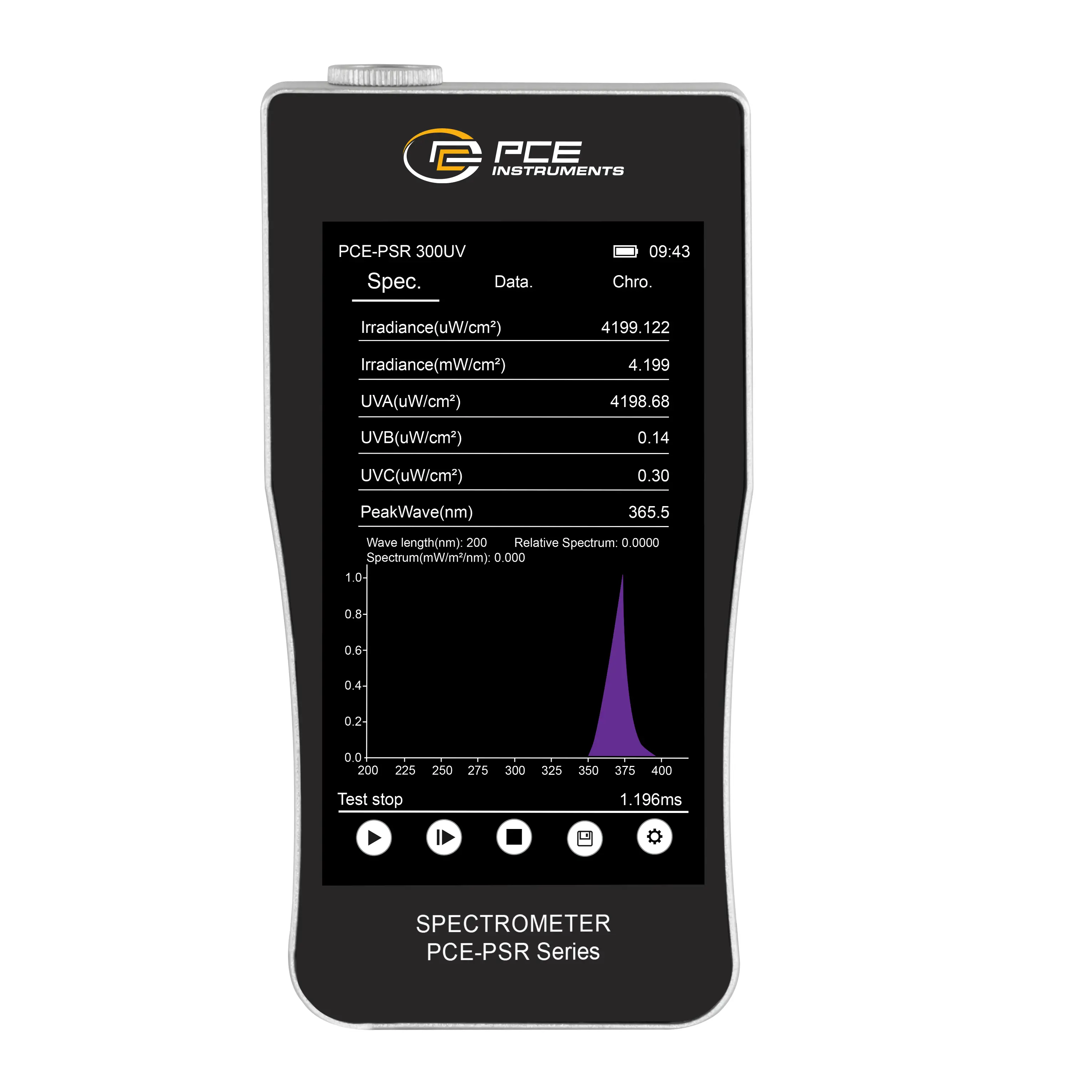 | Parámetros luminosos | Irradiancia (µW/cm²) , Irradiancia (mW/cm²) , UV hazard Ee (µW/cm²), UVA (µW/cm²) , UVB (µW/cm²) , UVC (µW/cm²) , PeakWave (nm), HalfWidth (nm) , Darksignal, Peaksignal, IntegTime (ms), Transmitancia (%) |