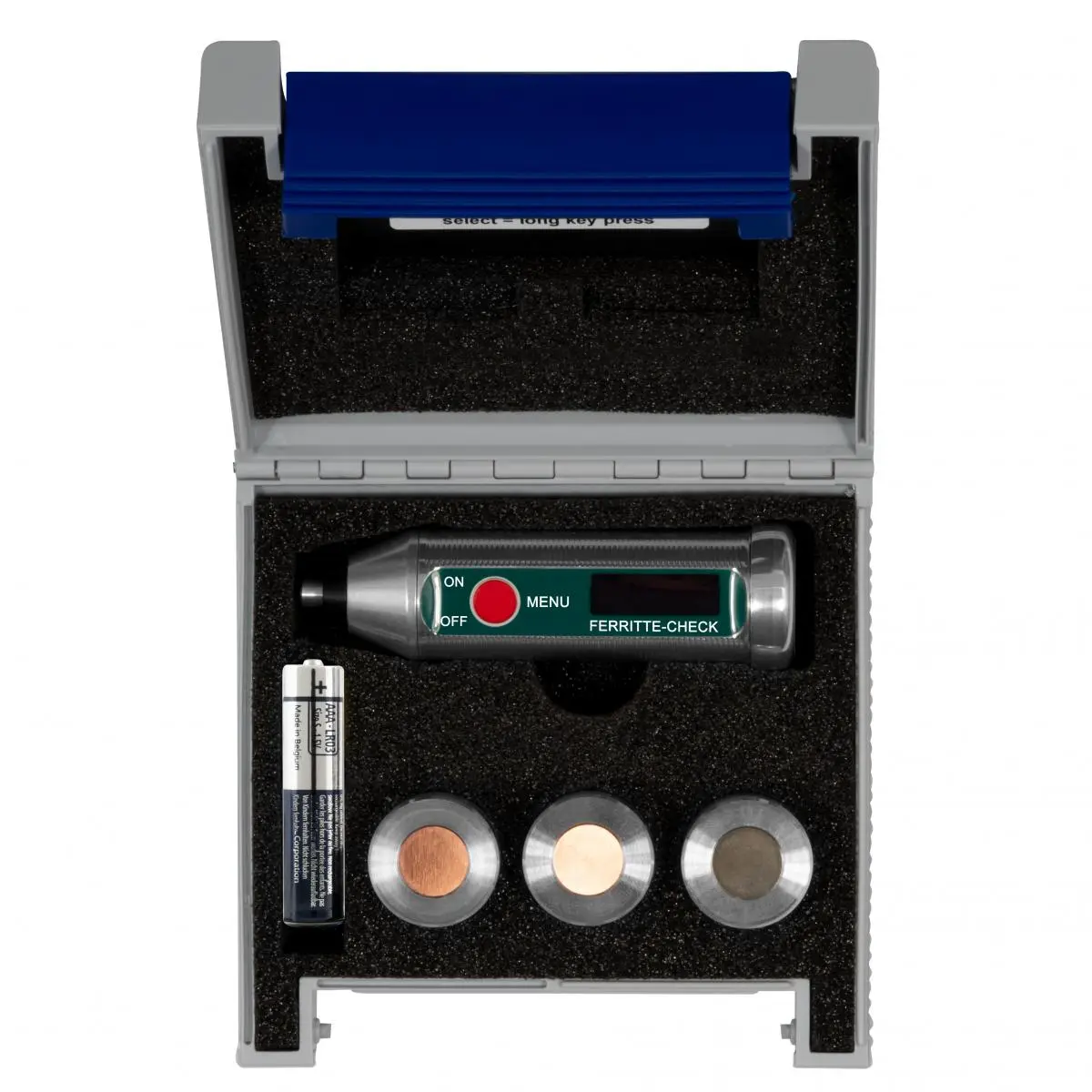 Proponowany ferrytoskop z wbudowaną sondą wykonuje pomiar zawartości ferrytu pojedynczy lub ciągły z uśrednianiem wyniku, w spoinach stali austenitycznych oraz w stalach typu duplex. Pomiar urządzeniem typu ferrytoskop wykonywany jest metodą indukcji magnetycznej, a wzorce kalibracyjne, które znajdują się w zakresie dostawy urządzenia typu ferrytoskop zgodne są z normą PN-EN ISO 8249. Miernik typu ferrytoskop wyposażony jest w podświetlany wyświetlacz typu OLED, pamięć wewnętrzną do 4.000 wartości pom.
