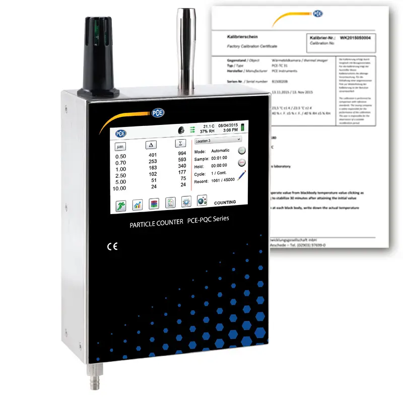 Miernik cząstek stałych serii PCE-PQC 3xEU jest najbardziej zaawansowane urządzenie do pomiaru cząstek stałych na rynku. Integracja z systemem automatyki budynkowej i systemem zarządzania pomieszczeniami czystymi jest łatwo możliwa za pośrednictwem sieci Ethernet lub (opcjonalnie) sieci bezprzewodowej 802.11 b/g, RS485 lub RS232. Miernik cząstek stałych mierzy 6 wybranych przez użytkownika kanałów wielkości cząstek, a także (opcjonalnie) temperaturę i wilgotność względną. To urządzenie do pomiaru cząstek stałych przechowuje do 45 000 odczytów ze znacznikiem czasu.