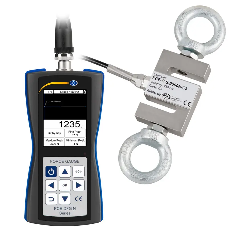 Dostępne są różne stanowiska do badania siły w celu dostosowania do siłomierza. Wewnętrzna pamięć danych oraz dołączone haczyki, przedłużki i końcówki dopełniają możliwości tego siłomierza. Podczas pomiaru sił zaufaj sprawdzonej jakości przemysłowej. Cechą szczególną siłomierza PCE-DFG N jest możliwość wymiany cel pomiarowych pomiędzy modelami. Wprowadzając czułość w mV/V, wszystkie cele pomiarowe mogą być używane z tylko jednym urządzeniem ręcznym.