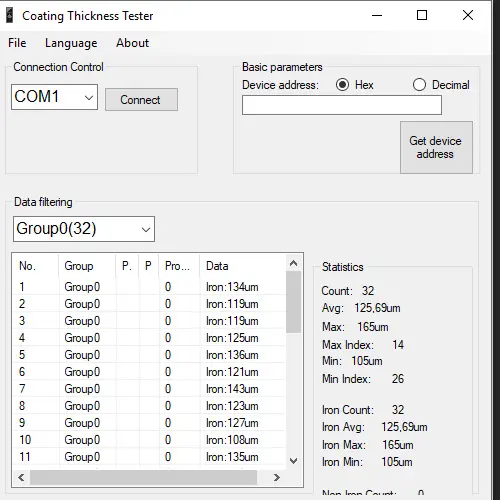W zestawie z miernikiem grubości powłoki znajduje się odpowiednie oprogramowanie do oceny wyników pomiarów na komputer. Jest to łatwe w obsłudze oprogramowanie, które dostarcza również wyczerpujących informacji o wynikach pomiarów. Grupy robocze mogą być odczytywane indywidualnie, częściowo lub w całości. Po odczycie można wybrać poszczególne grupy. Kompletna seria pomiarów wraz z odpowiednimi miejscami w pamięci, właściwościami materiału (żelazne lub nieżelazne) oraz grubością materiału jest następnie wyświetlana w tabeli. Dodatkowo oprogramowanie dostarcza informacji o tym ile wartości mierzonych zostało zapisanych w grupie, jaka jest maksymalna i minimalna wartość grupy oraz jaka jest średnia wartość zmierzonych wartości. Pokazuje również, ile odczytów wykonano na materiałach żelaznych i nieżelaznych. Wyjaśniono również, jaką średnią, maksymalną i minimalną wartość miały te pomiary. Więcej szczegółowych informacji na temat oprogramowania znajduje się w instrukcji obsługi miernika grubości lakieru.