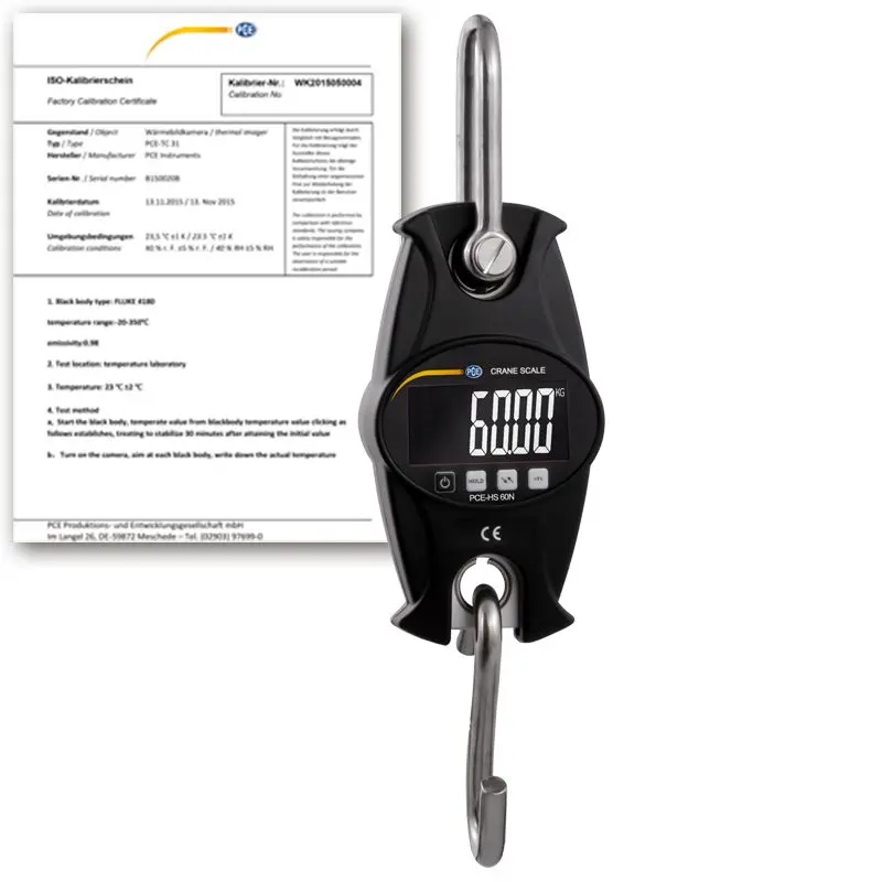 A balança de gancho com faixa de pesagem de 0 ... 60 kg. A balança de gancho é um instrumento de medição preciso, pois pesa com uma precisão de ±1 % F.S. O display LCD integra dígitos de 22 mm de altura. Isso, somado ao fato da tela possuir retroiluminação, permite ao usuário ler os valores à distância, mesmo em áreas com pouca luz.