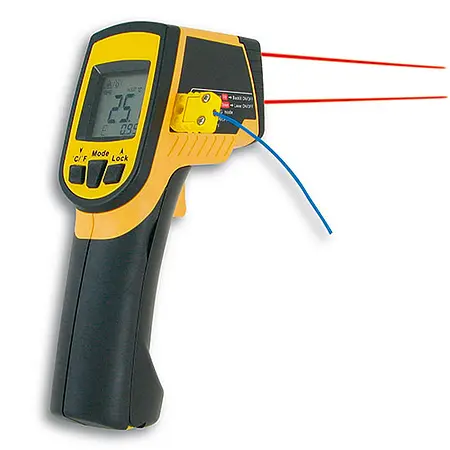 Termoelement girişli Kızılötesi Termometre / Çift-Lazer / Büyük Ekran / + 550 °C'ye kadar ölçüm aralığı / Kısa yanıt süresi (< 1 Saniye) / Ayarlanabilir emisyon seviyesi / Arka plan aydınlatmalı / Limit değer alarmı / HOLD/MAX/MIN/DIF/AVG/LOCK-Fonksiyonu