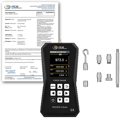 Gerginlik ölçer PCE-DFG 1000 X, çekme ve basma kuvvetlerini yüksek hassasiyetle ölçmek için kullanılabilir. Çekme ve basma kuvveti, genellikle test laboratuvarlarında akma noktasını ve yırtılma kuvvetini tespit edebilmek için belirlenir. Gerginlik ölçerde dahili bir ölçüm hücresi bulunur ve bu ölçüm hücresiyle 1000 N’a kadar olan kuvvetler ölçülebilir. Ölçüm hücrelerine M6 vida dişi olan çeşitli halkalar veya kancalar takılabileceği gibi bu dişe sahip cihazlarınız da ölçüm hücresine monte edilebilir.