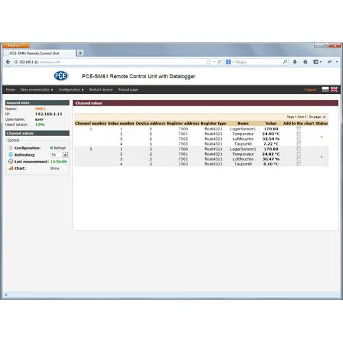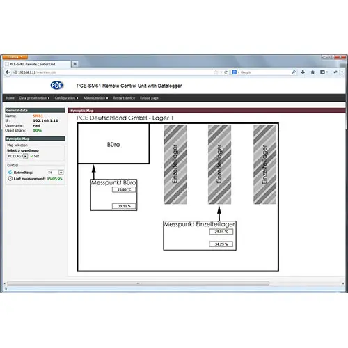 Veri kaydedici PCE-SM61, işlem verilerinin internet üzerinden hızlı ve kolay bir şekilde sorgulanmasını sağlar. RS485 arayüzü bulunan herhangi bir cihaz veri kaydediciye bağlanabilir. Veri sorgulama internet tarayıcısı aracılığıyla gerçekleşir ve birden fazla kullanıcı tarafından bilgisayar, akıllı telefon, tablet vb. kullanılarak aynı anda yapılabilir. Veri kaydedici veri sorgulamanın haricinde alarm oluşturabilir. Yapılandırma, USB ya da Ethernet arayüzü aracılığıyla yapılabilir.