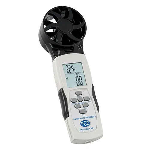 The Air Velocity Meter PCE-THA 10 with compact size, new structure and integrated vane anemometer is equipped with a one-hand operation. Besides the wind speed, the Air Velocity Meter measures the temperature, the humidity, the dew point, wet bulb temperature and the air volume. It is possible to save 5 areas. The average wind speed can be determined from the 20 storable points. Min and Max function. It is possible to record a measuring with the HOLD-function. The Air Velocity Meter is equipped with an easy to read, large display with switchable backlight and automatic cutoff. With the included software and USB cable, you can analyze the measurements at the computer. The Air Velocity Meter is ideal for heating, ventilation, and air-conditioning engineers or for sailors to measure the wind speed on a sailing tour.