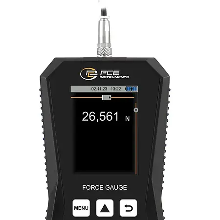 The internal memory of 32 GB offers space for 30 million measuring points. This allows measurement logs to be created, saved and exported. The dynamometer has a USB-C interface that can be used to read the measurement data into the PC software. The device is equipped with a graphic LCD that displays the measured values both numerically and graphically. In addition, a bar chart shows the measured value in the selected measuring range. The measuring cell is protected to IP67 and can therefore also be used in harsh industrial environments.