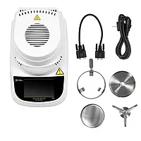 For the weighing task, the benchtop scale has an electromagnetic load cell installed which registers the weight loss with a measuring resolution of 0.1 mg = 0.0001 g. For the drying of the sample, a moisture analyzer is installed in the sample chamber. For drying the sample a 400 Watt halogen round lamp is used in the lid to ensure an even heat distribution.