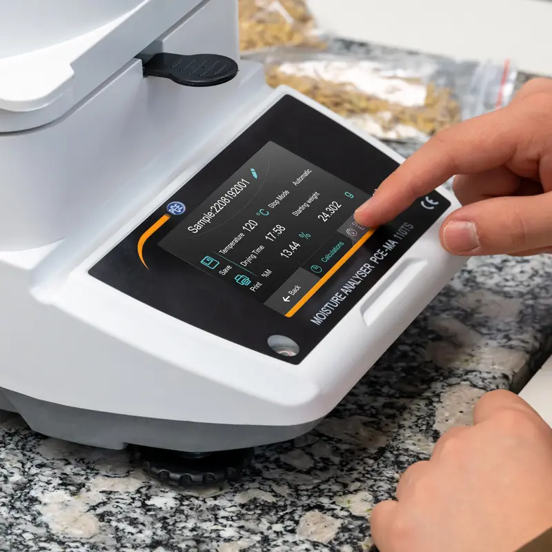 Due to the drying process of the sample, the laboratory balance can be used in many areas. Thus, the moisture balance is used in laboratories, for example, to measure the moisture of different powders, in final quality control to determine the moisture of granules or in agriculture or the agricultural sector to determine the moisture content of oats, grain or wheat.
